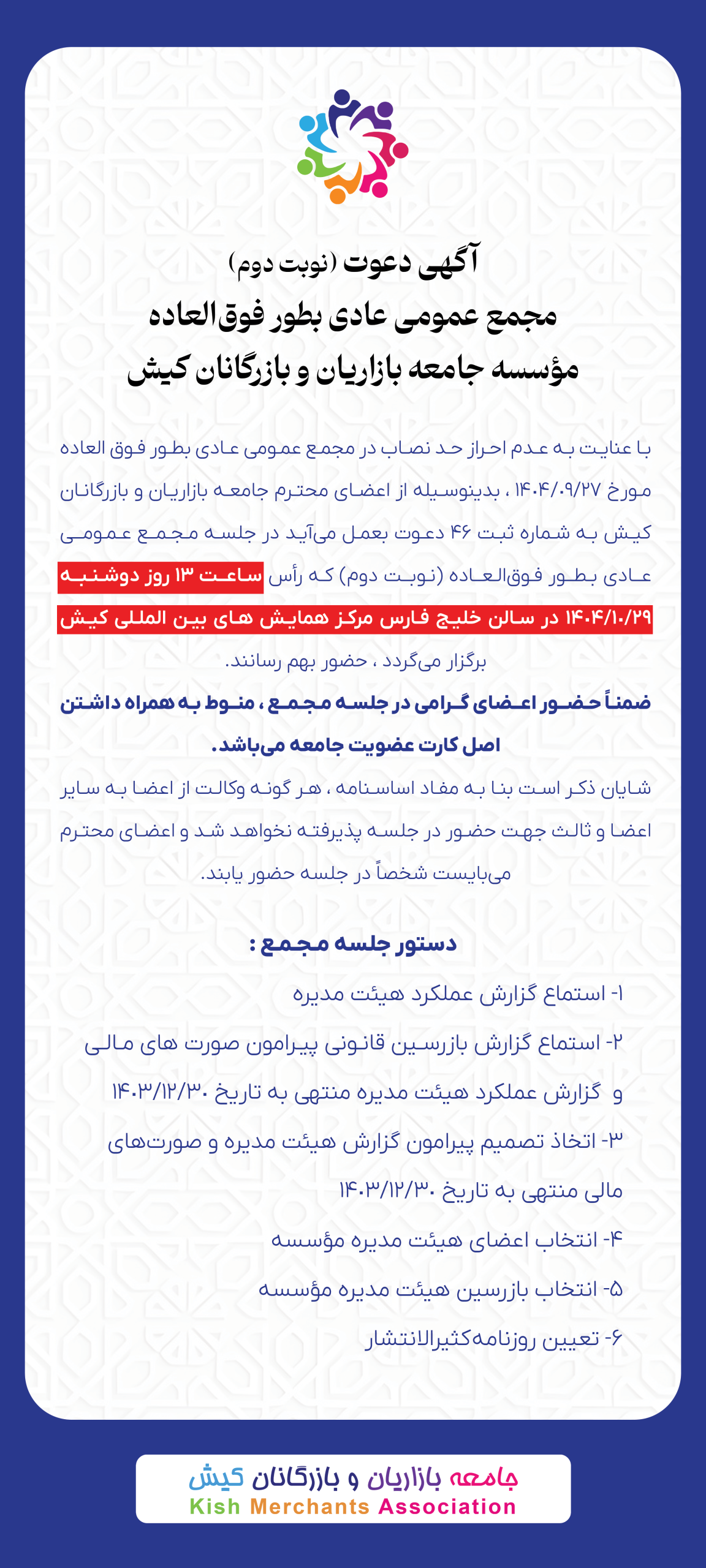 با عنایت به عدم احراز حد نصاب در مجمع عمومی عادی بطور فوقالعاده مورخ ۱۴۰۴/۰۹/۲۷، بدینوسیله از اعضای محترم جامعه بازاریان و بازرگانان کیش به شماره ثبت ۴۶ دعوت بعمل میآید در جلسه مجمع عمومی عادی بطور فوقالعاده (نوبت دوم) که رأس *ساعت ۱۳ روز دوشنبه ۱۴۰۴/۱۰/۲۹ در سالن خلیج فارس مرکز همایشهای بینالمللی کیش* برگزار میگردد، حضور بهم رسانند.
