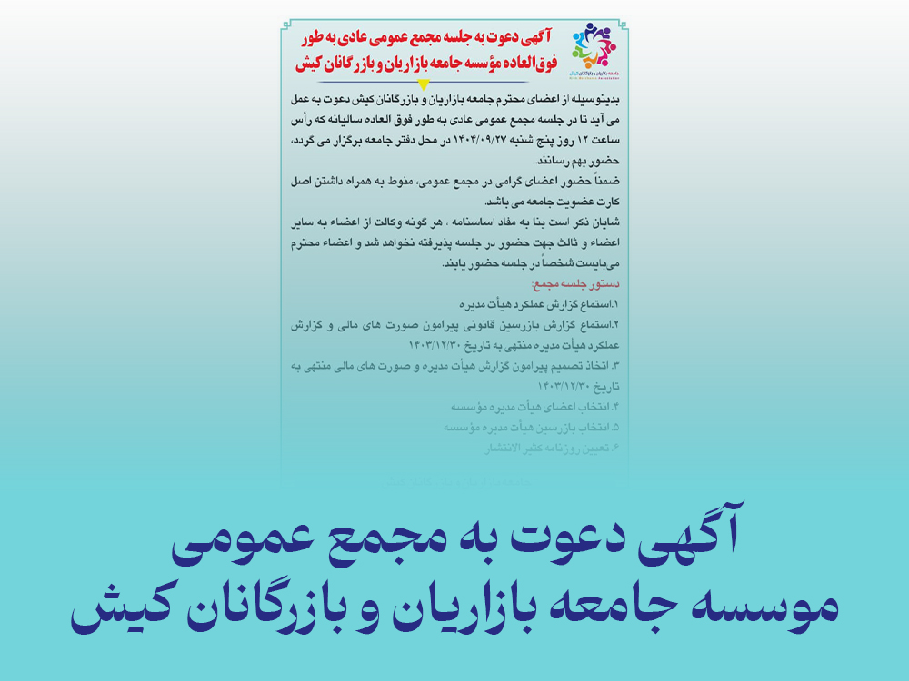 آگهی دعوت به جلسه مجمع عمومی عادی بهطور فوقالعاده مؤسسه جامعه بازرگانان و بازاریان کیشاپراتور۱۴۰۴/۹/۱۷ ،۰۷:۰۳:۰۶ +۰۰:۰۰۱۴۰۴/۰۹/۱۷|اخبار|